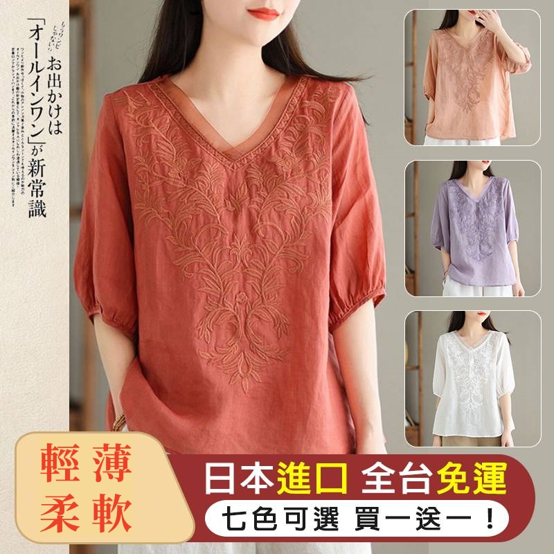 日系棉麻V領中袖 輕薄柔軟不悶熱 上身顯氣質 七色可選